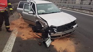 Ke srážce osobního automobilu s nákladním vyjeli hasiči na silnici I/13 v katastru Mostu. Nehoda je bez zranění, hasiči sorbentem zasypávají uniklé provozní kapaliny. Jeden jízdní pruh je neprůjezdný.